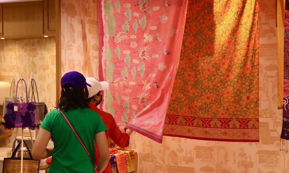 DIBURU KOLEKTOR : Pengunjung tertarik produk batik Indonesia, di ajang Dubai Expo 2020, belum lama ini. Para kolektor yang berkunjung di Paviliun Indonesia gemar memburu batik nasional.