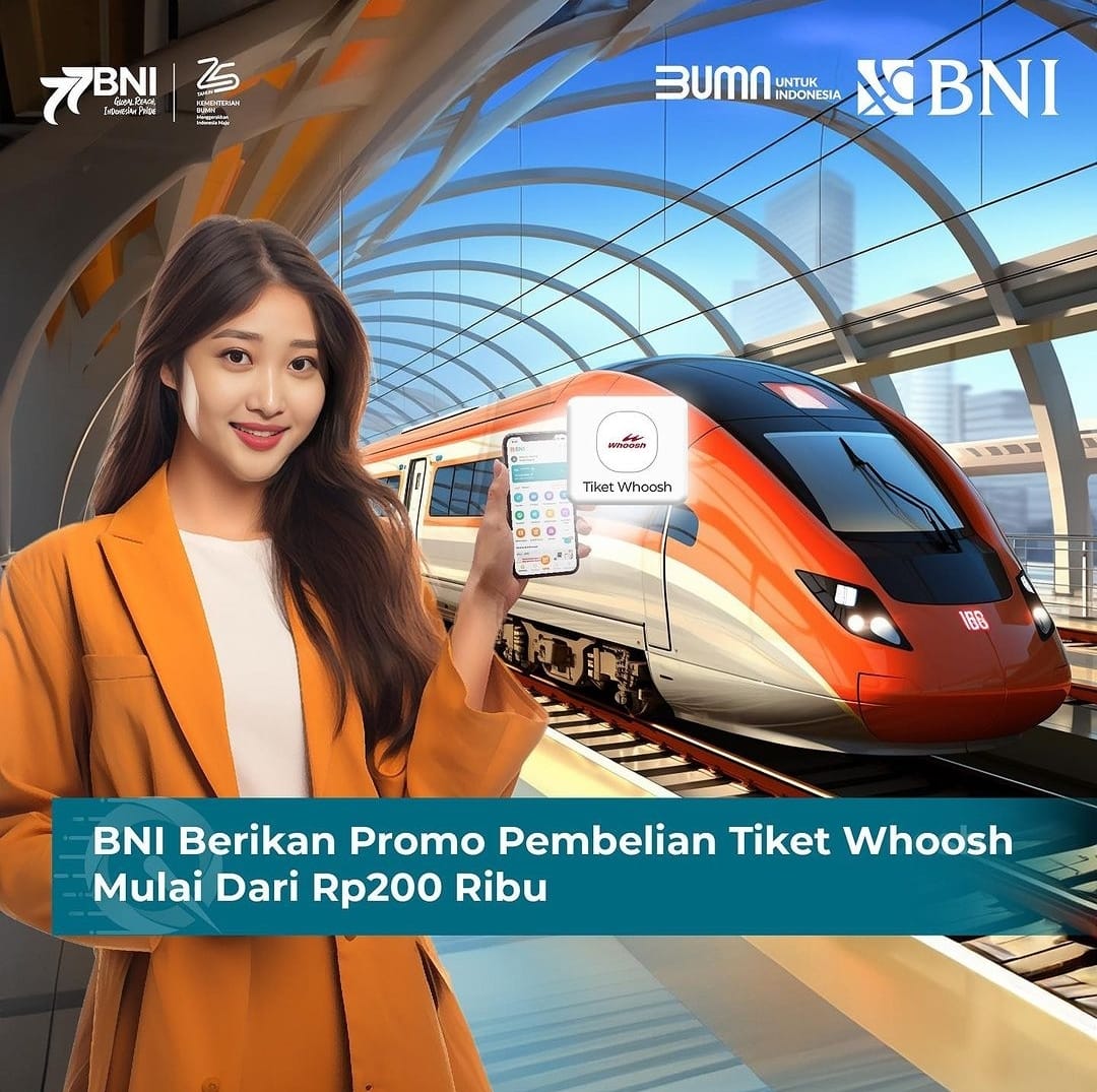 Dengan menggunakan aplikasi BNI Mobile Banking, nasabah dapat memesan tiket Whoosh mulai dari Rp200 ribu dari harga awal Rp250 ribu. Promo ini terbatas pada keberangkatan hingga 31 Desember 2023.