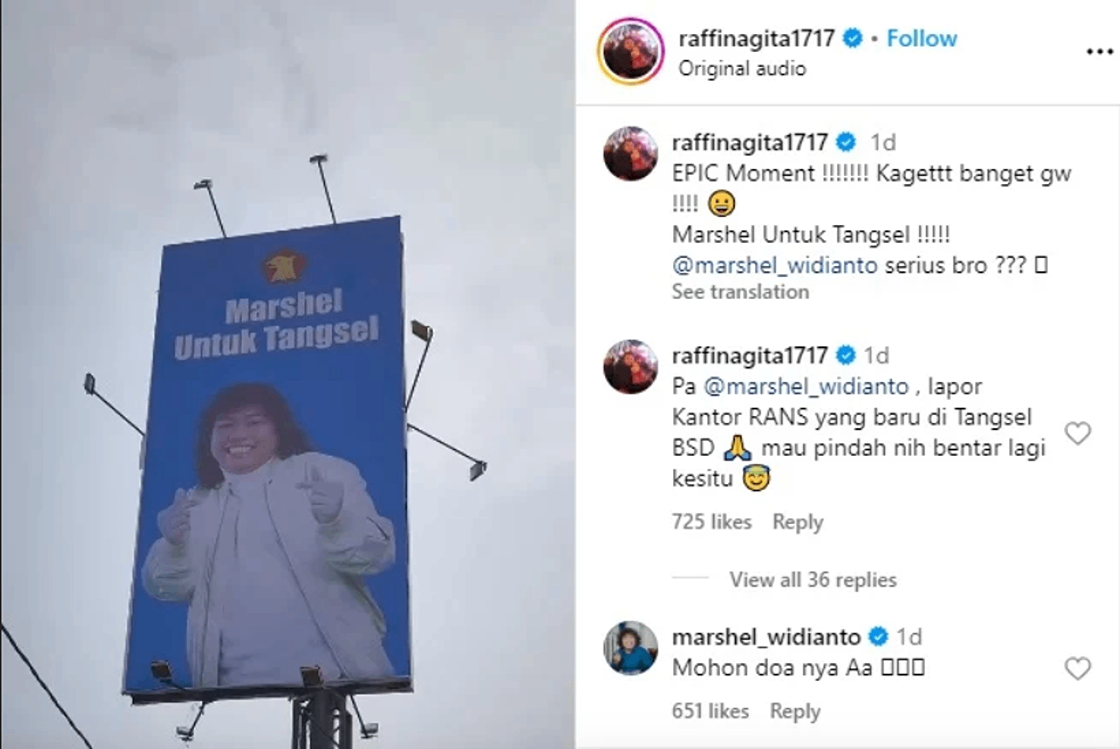 “EPIC Moment !!!!!! Kagettt banget gw !!!! Marshel Untuk Tangsel !!!!!” tulis Raffi Ahmad.