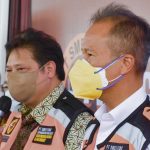 HILIRISASI INDUSTRI : Menperin Agus G Kartasasmita bersama Menko Perekonomian, Airlangga Hartarto berbincang disela-sela kunjungan di pabrik katoda tembaga, di Surabaya, Minggu (20/2).