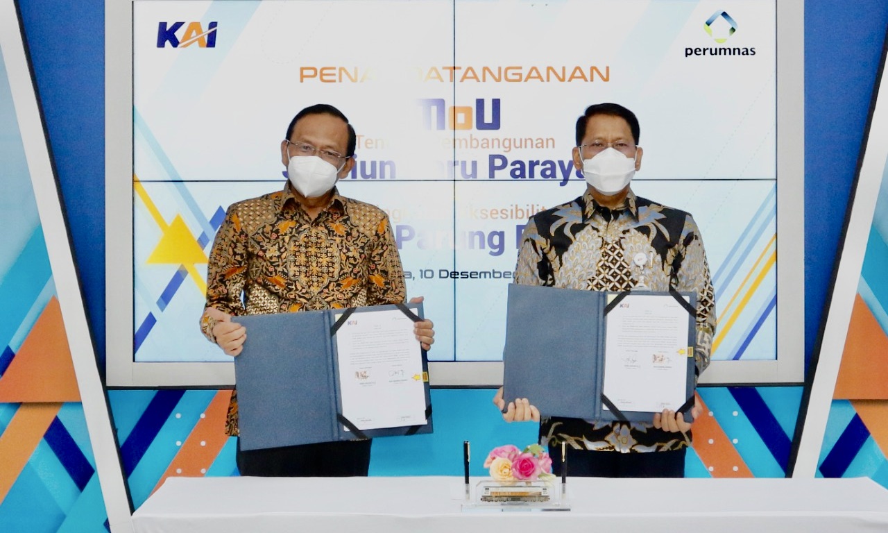 JAKARTA, Bisnistoday – PT Kereta Api Indonesia (Persero) dan Perum Perumnas menandatangani nota kesepahaman (MoU) tentang Rencana Kerja Sama Pembangunan Stasiun Baru Parayasa dan Peningkatan Aksesibilitas Stasiun Parung Panjang. Penandatanganan MoU tersebut dilakukan oleh Direktur Utama KAI Didiek Hartantyo dan Direktur Utama Perumnas Budi Saddewa Soediro di Jakarta Railway Center (JRC), Jakarta, Jumat (10/12).