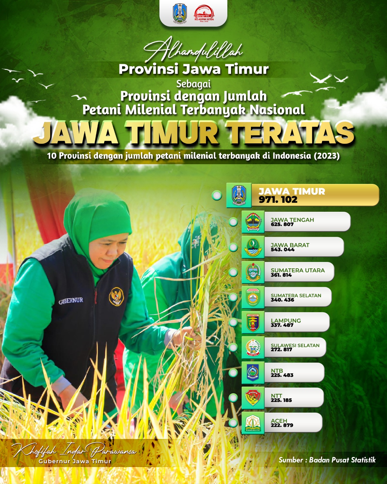 Khofifah mengungkapkan, jumlah petani milenial ini juga menunjang posisi Jatim yang merupakan lumbung pangan nasional untuk support 16 provinsi di wilayah Indonesia Timur. Yang mana, selama 4 tahun berturut-turut sejak 2020 sampai dengan 2023 Jatim merupakan produsen Padi tertinggi di antara seluruh provinsi di Indonesia.