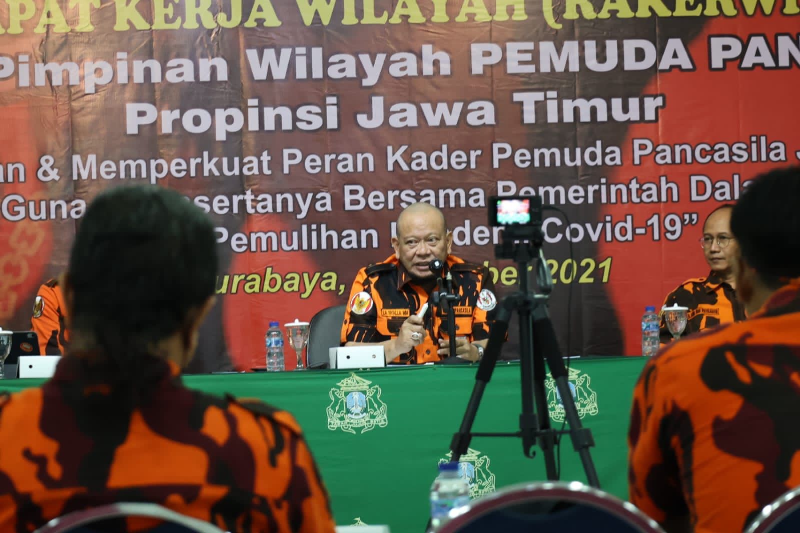 Ajakan itu disampaikan LaNyalla dalam Rapat Kerja Wilayah Pemuda Pancasila Jawa Timur di Surabaya, Minggu (10/10). Rakerwil dengan tema ‘Menegaskan dan Memperkuat Peran Serta Pemuda Pancasila Jawa Timur bersama Pemerintah dalam Upaya Pemulihan Pandemi Covid-19’, diikuti Ketua MPC se-Jawa Timur dan kader lainnya.