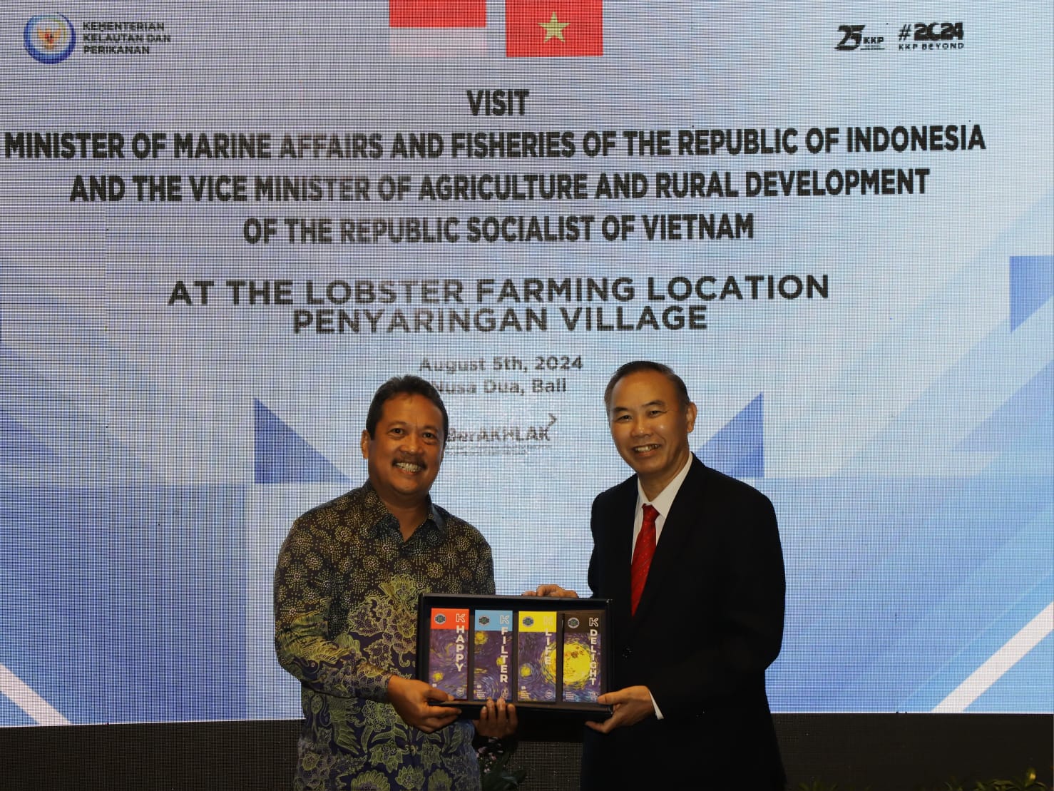 “Saya mengucapkan terima kasih atas dukungan Kementerian Pertanian dan Pengembangan Pedesaan Viet Nam atas kerjasama pengembangan perikanan di Indonesia, khsusnya komoditas lobster,” kata Menteri Trenggono saat bertemu dengan Wakil Menteri Pertanian dan Pengembangan Pedesaan Vietnam, Phung Duc Tien, di Bali, Senin (05/08)