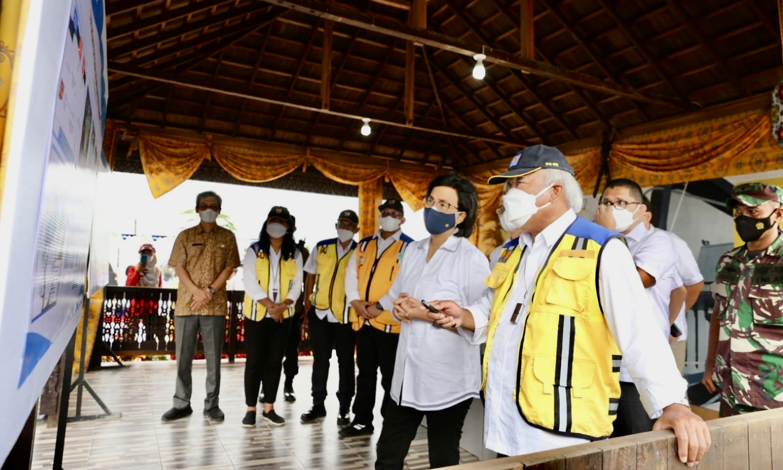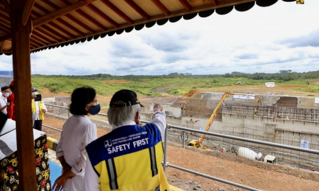 PENAJAM PASER UTARA – Menteri Pekerjaan Umum dan Perumahan Rakyat (PUPR) Basuki Hadimuljono bersama Menteri Keuangan Sri Mulyani meninjau pembangunan Bendungan Sepaku Semoi yang berada di Desa Tengin Baru, Kecamatan Sepaku, Kabupaten Penajam Paser Utara, Provinsi Kalimantan Timur (Kaltim), Kamis (6/1).
