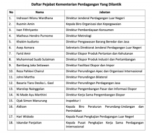 Adapun Pejabat Tinggi Madya yang dilantik adalah Indrasari Wisnu Wardhana dari Kepala Badan Pengawas Perdagangan Berjangka dan Komoditi menjadi Direktur Jenderal Perdagangan Luar Negeri.
