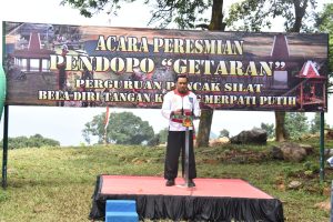 Acara peresmian Pendopo “Getaran” PPS Betako Merpati Putih Dodiklatpur Rindam Jaya, diawali dengan sambutan Dewan Guru Mas Sunarjo, dilanjutkan sambutan Ahli Waris Nehemia Budi Setiawan.