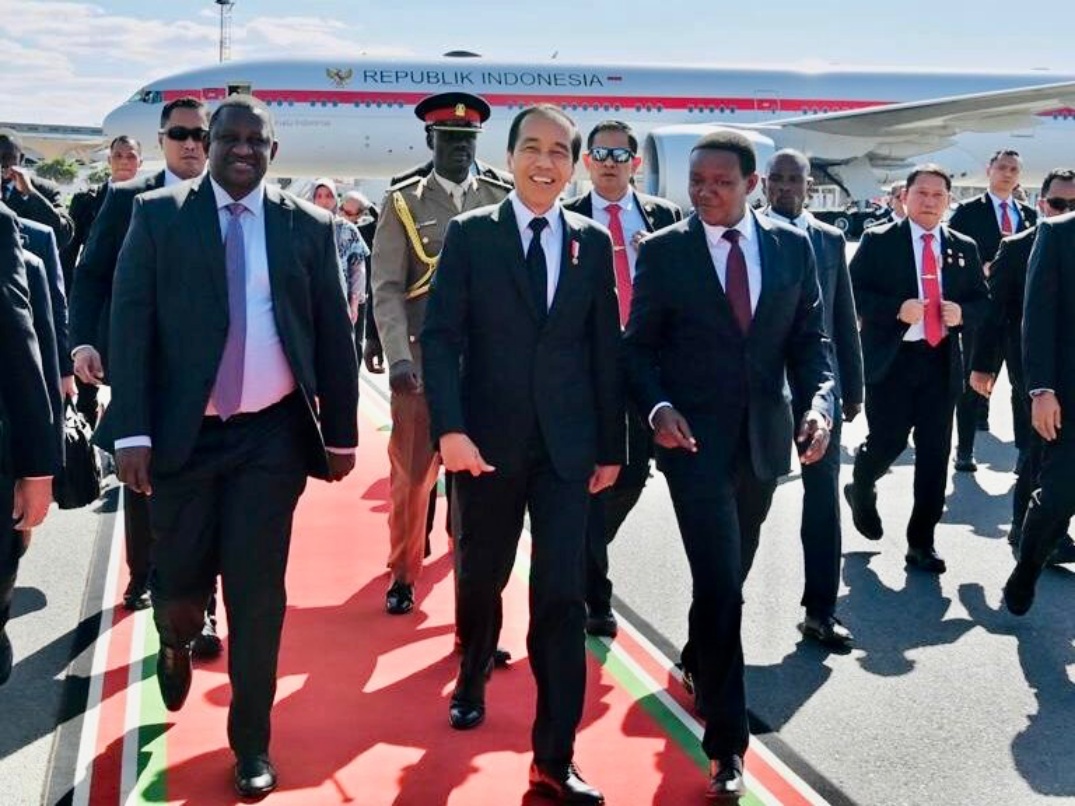 Presiden Joko Widodo tiba di Bandar Udara Internasional Jomo Kenyatta Nairobi, Republik Kenya, sekira pukul 15.15 waktu setempat (WS) atau 19.15 WIB, pada Minggu (20/8). Presiden Jokowi disambut Duta Besar RI untuk Republik Kenya Mohamad Hery Saripudin beserta istri dan Atase Pertahanan RI di Pretoria Kol. Mar. Burhanudin beserta istri.