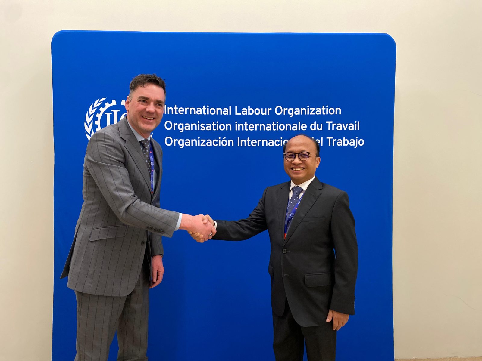 JENEWA,Bisnistoday–Sekretaris Jenderal Kementerian Ketenagakerjaan Anwar Sanusi mewakili Pemerintah Indonesia mengadakan pertemuan bilateral dengan Atase Sosial dan Ketenagakerjaan Belanda Roel Van de Ven, disela-sela Pertemuan Tingkat Tinggi International Labour Organization (ILO) di Jenewa Swiss.