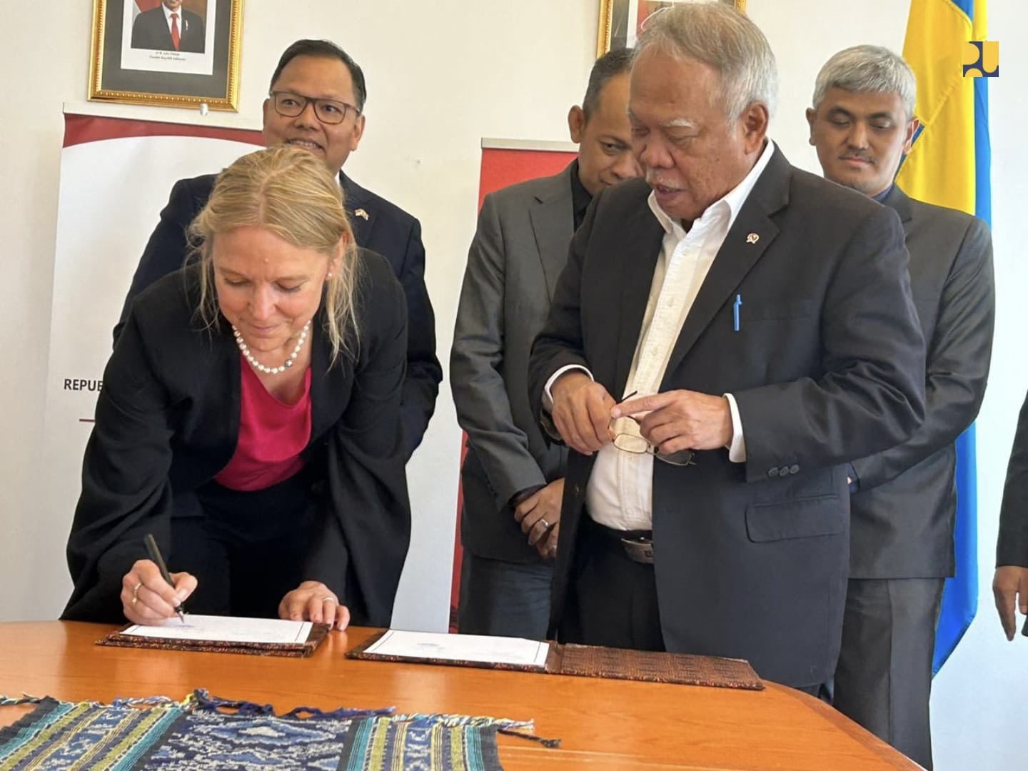 Penandatanganan dilakukan oleh Menteri Pekerjaan Umum dan Perumahan Rakyat (PUPR) Basuki Hadimuljono dan CEO Swedfund International AB Maria Håkansson di KBRI Stockholm, Swedia, Rabu (23/8).